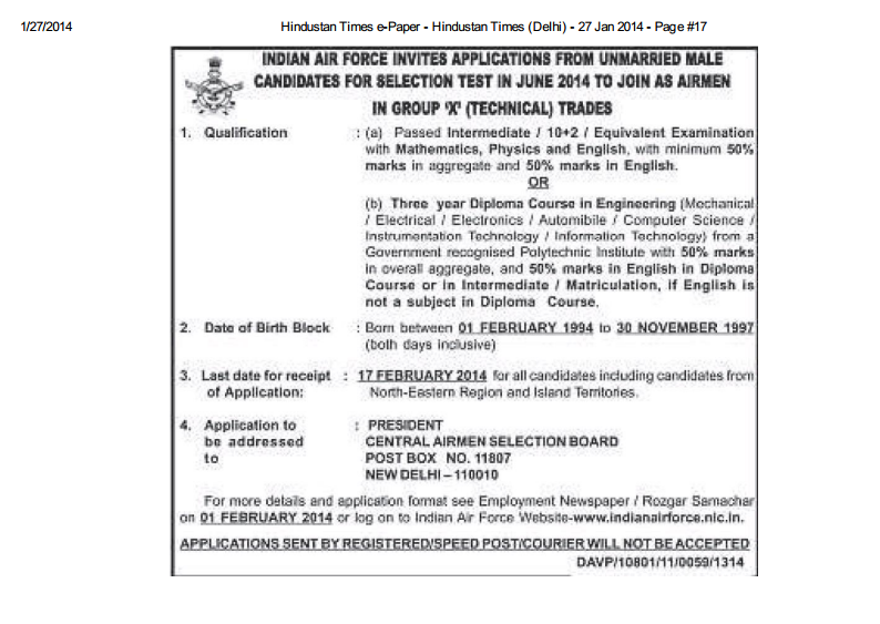 Indian Air Force, notifies for Indian Air Force Recruitment 2014 to fill up the application form of various number of vacancies. These vacancies are for Airmen in group ‘X’ (Technical) Trades. All Eligible Candidates can easily apply online for this govt vacancy through prescribed application form Before 17th February, 2014. More Information regarding this Group ‘X’ Technical Post, you can find below in the post-