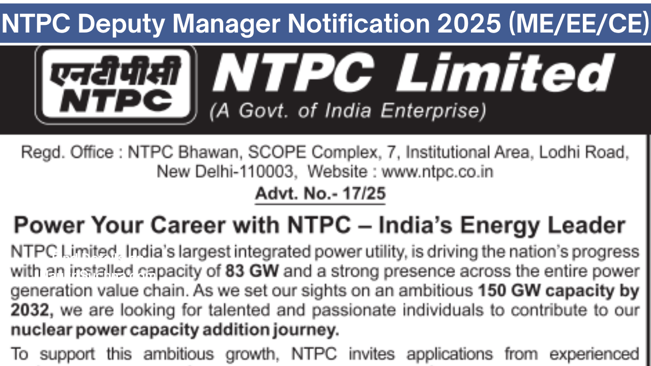 The National Thermal Power Corporation (NTPC) has released the notification for Deputy Manager (Electrical, Mechanical and Civil Engineering) under advertisement no. 17/25. Candidates with B.Tech degree from a recognized university are eligible to apply for the position. The application process begins on 7 October and the last date to apply is 21 October 2025. Get all information regarding the application process, last date, exam date, admit card, and others in this article.